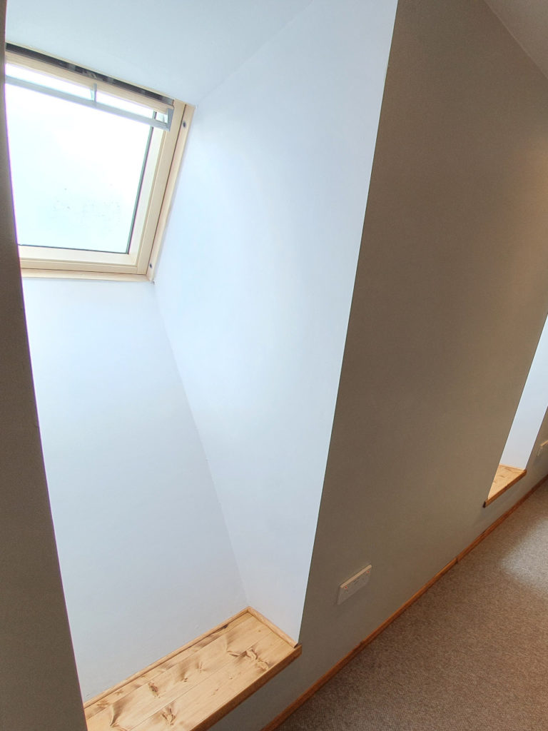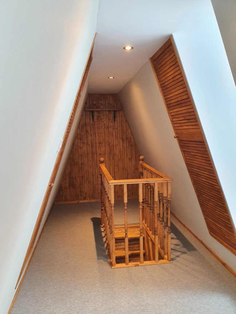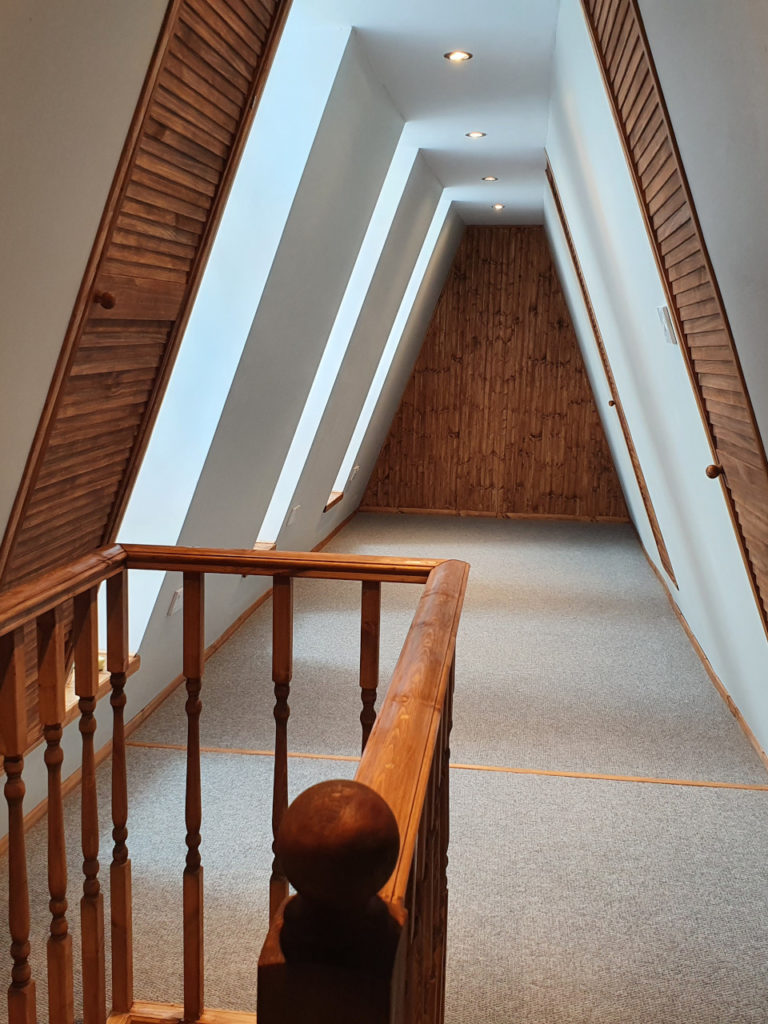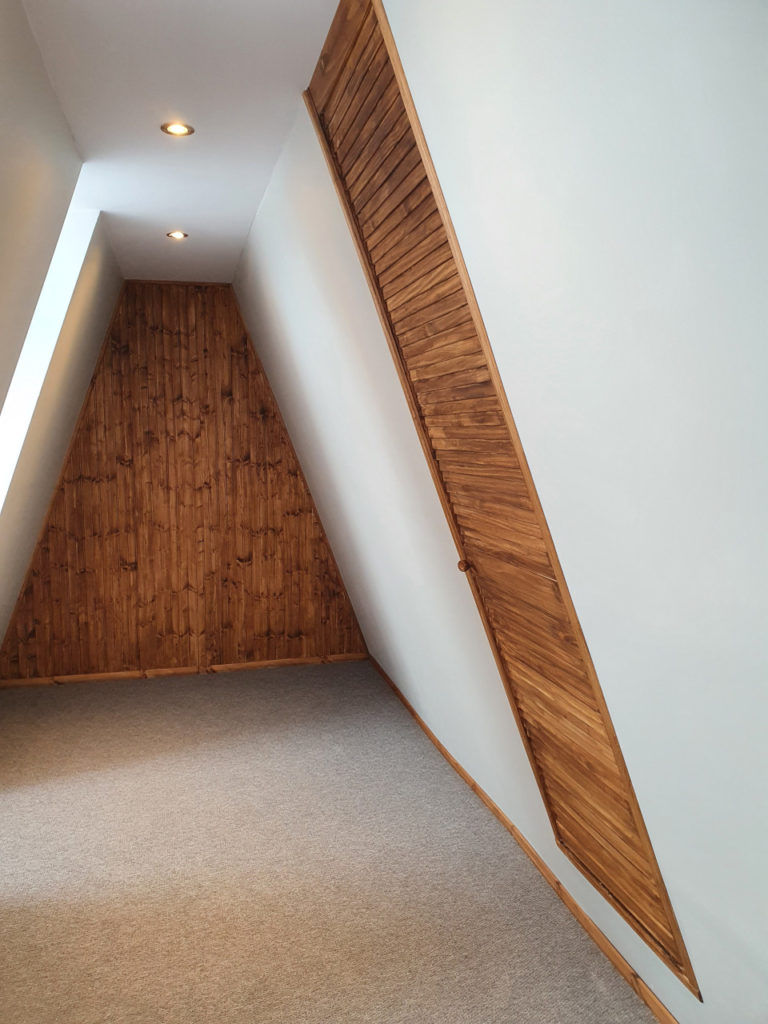 We had to make a new ceiling to fit the spotlights. Walls were made from steel frame and platerboards. Whole room has been isolated with isolation sheets. To gain sun light we installed 3 velux windows. All finished with cladding, wooden doors, window sills and stair rails in wood stain.