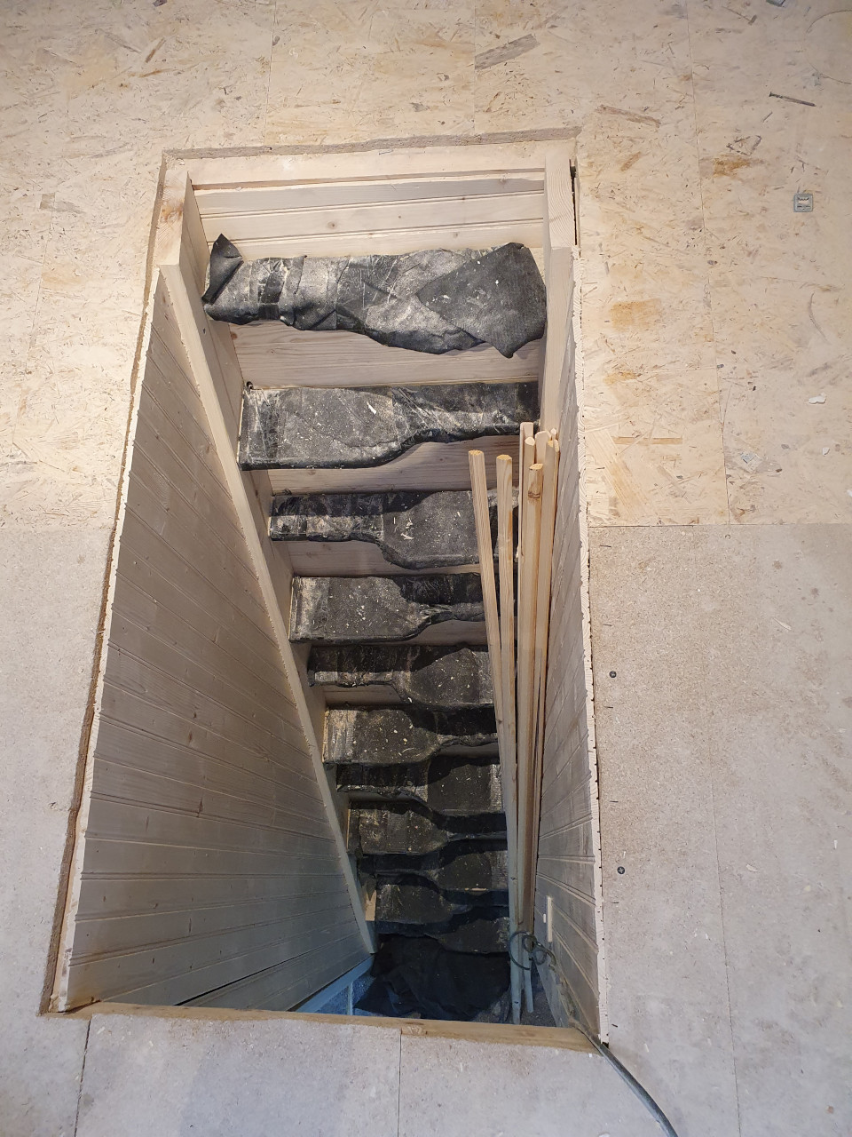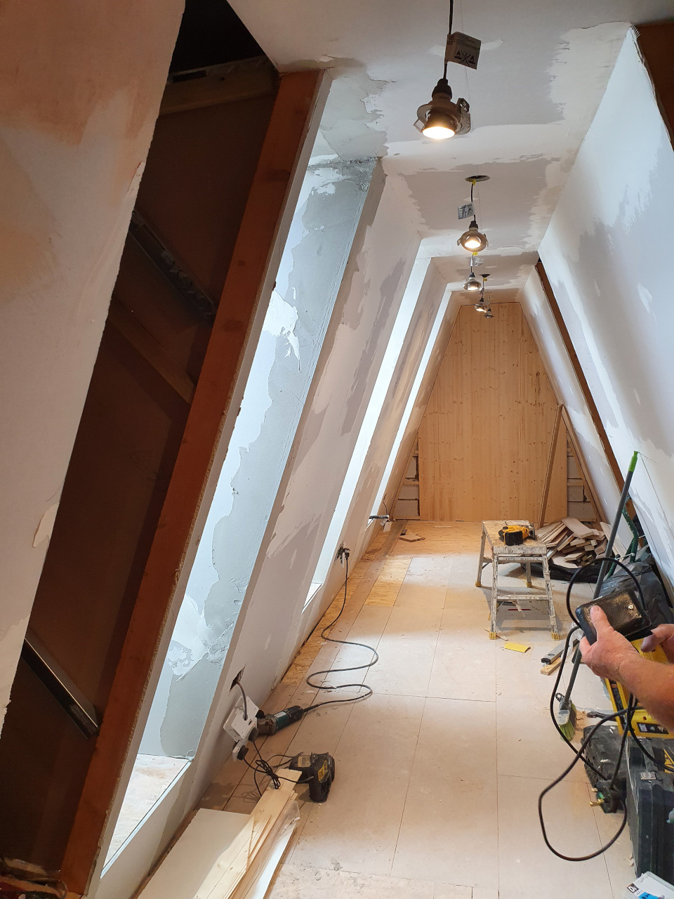 We had to make a new ceiling to fit the spotlights. Walls were made from steel frame and platerboards. Whole room has been isolated with isolation sheets. To gain sun light we installed 3 velux windows. All finished with cladding, wooden doors, window sills and stair rails in wood stain.