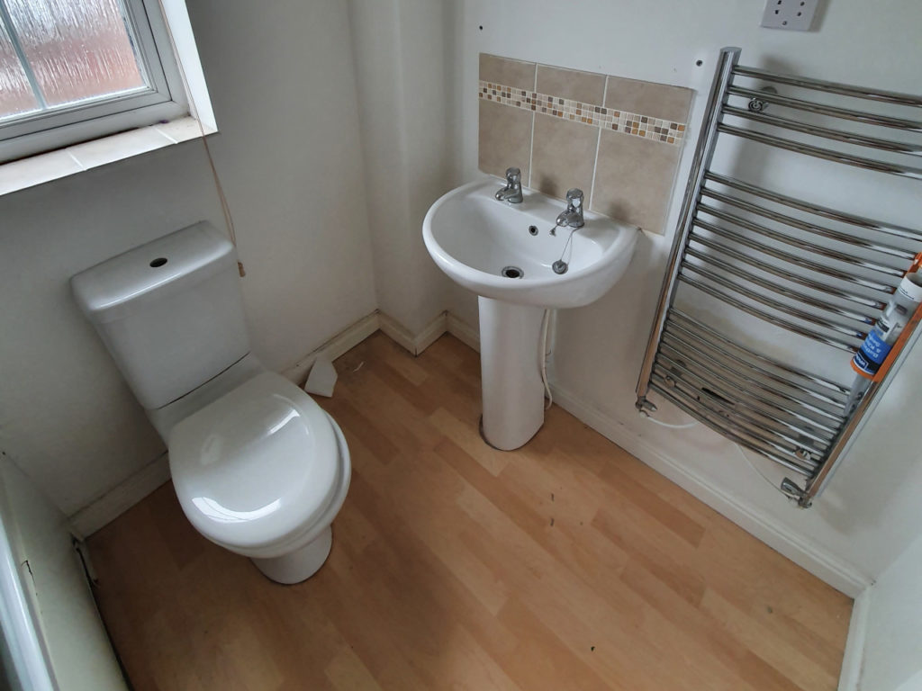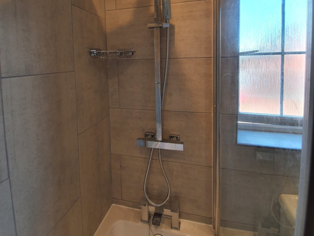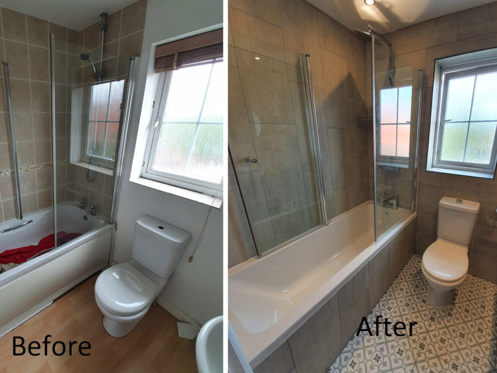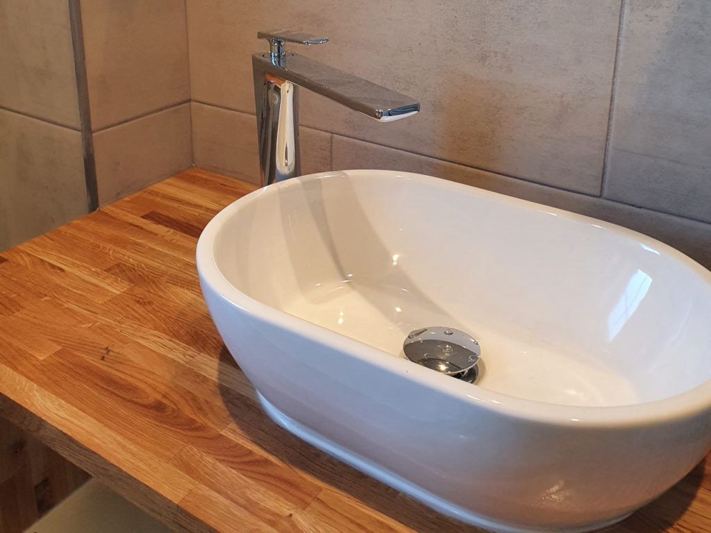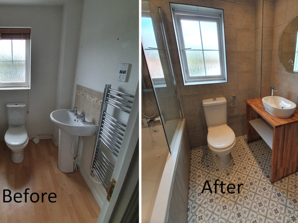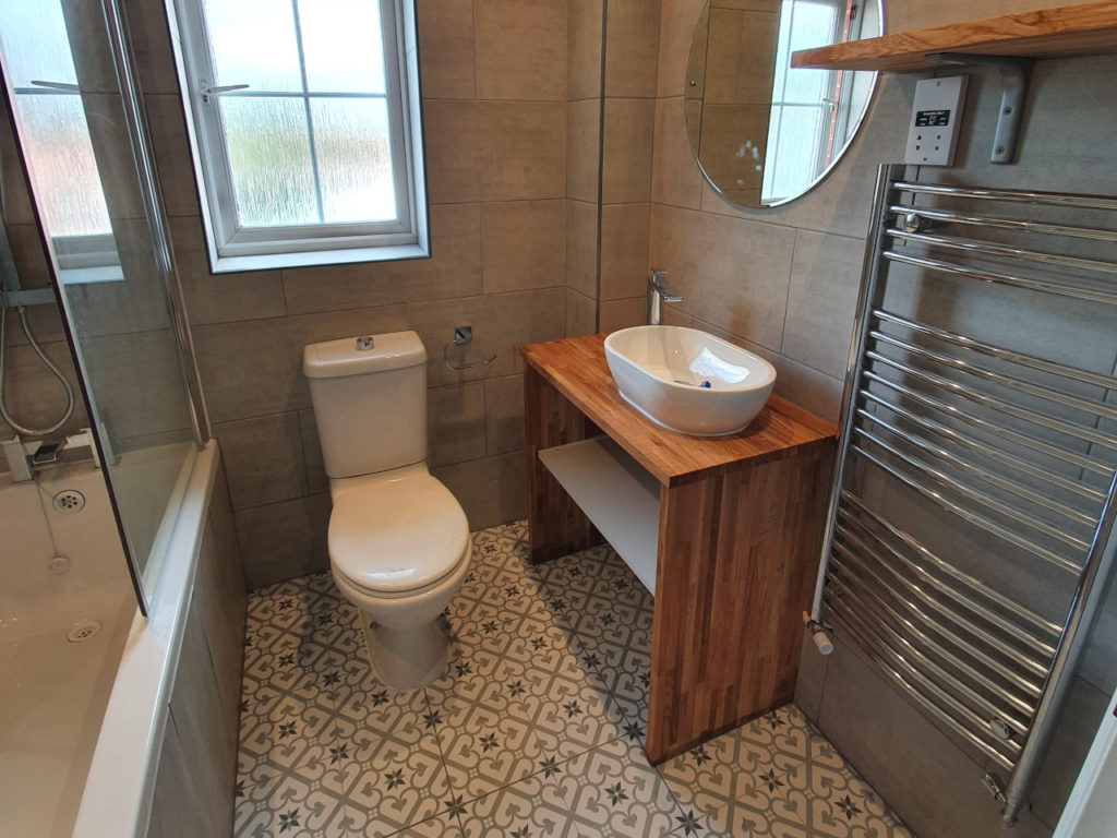 Bathroom renovation done in King’s Lynn area. Work included changing bath, basin, tiling all bathroom, installing spotlights, new radiator and making basin unite with solid oak. We had some oak left, so we also made a shelv for nice finish.