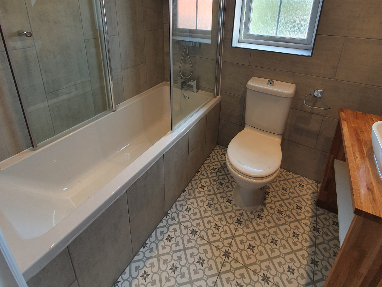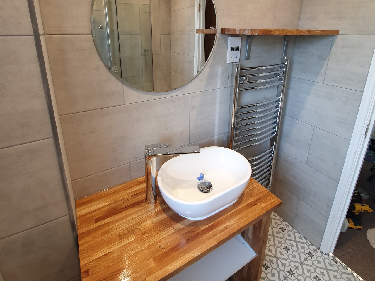 Bathroom renovation done in King’s Lynn area. Work included changing bath, basin, tiling all bathroom, installing spotlights, new radiator and making basin unite with solid oak. We had some oak left, so we also made a shelv for nice finish.