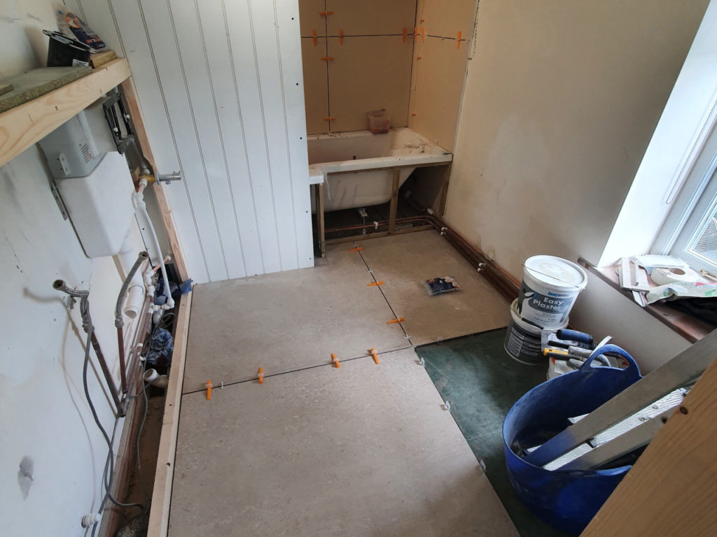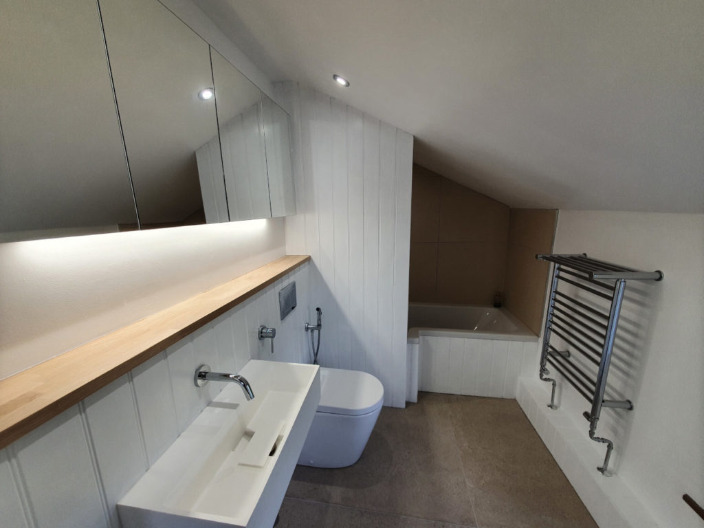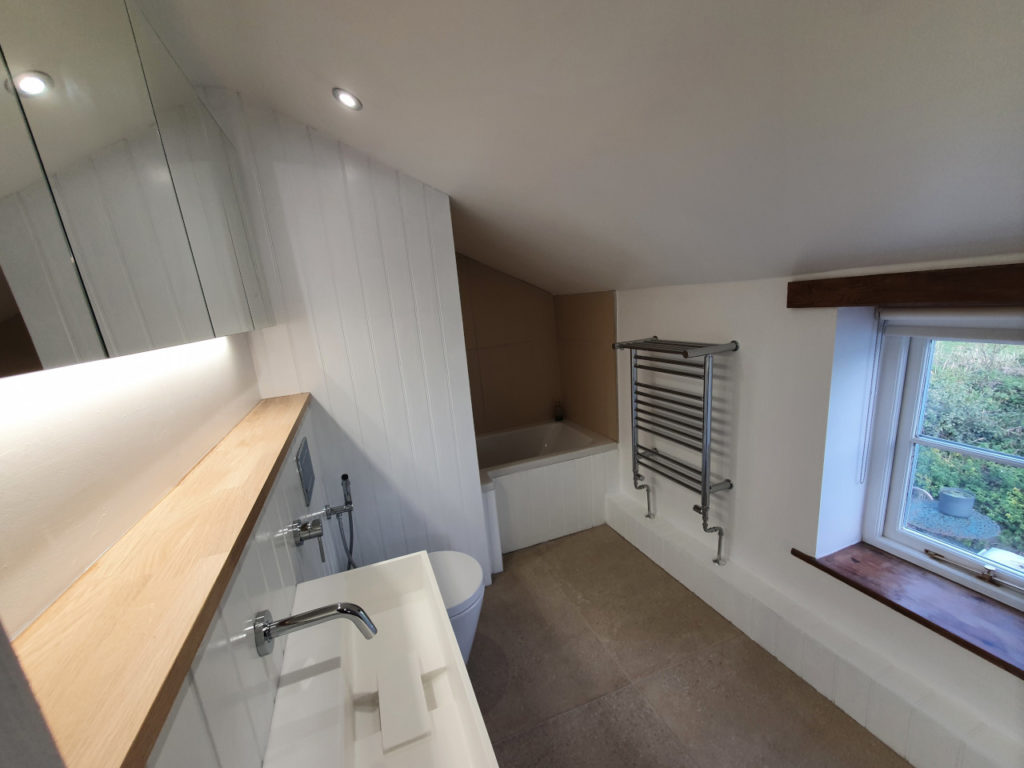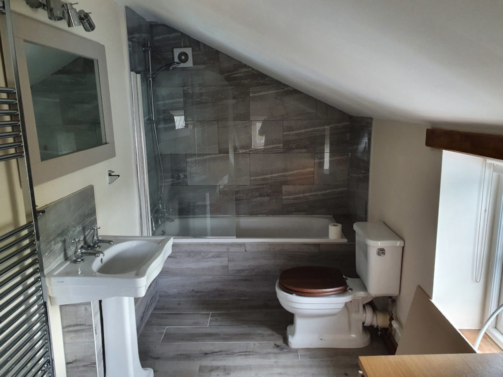 Great and challanging project done in Fakenham area. We changed large, not too pratical bathroom into stylish and modern bathroom and little home office room. The whole job required quite a lot planning, bath instead of having standard panel has been fully tiled. Integrated shower system installed. Internal wall build in to separte rooms, wardrobe build in to cover unwanted parts of the wall, all finished with wall panels.