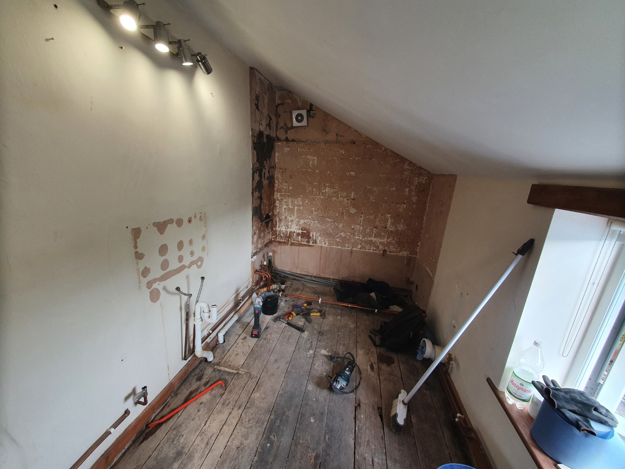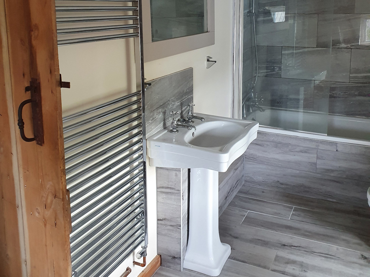 Great and challanging project done in Fakenham area. We changed large, not too pratical bathroom into stylish and modern bathroom and little home office room. The whole job required quite a lot planning, bath instead of having standard panel has been fully tiled. Integrated shower system installed. Internal wall build in to separte rooms, wardrobe build in to cover unwanted parts of the wall, all finished with wall panels.