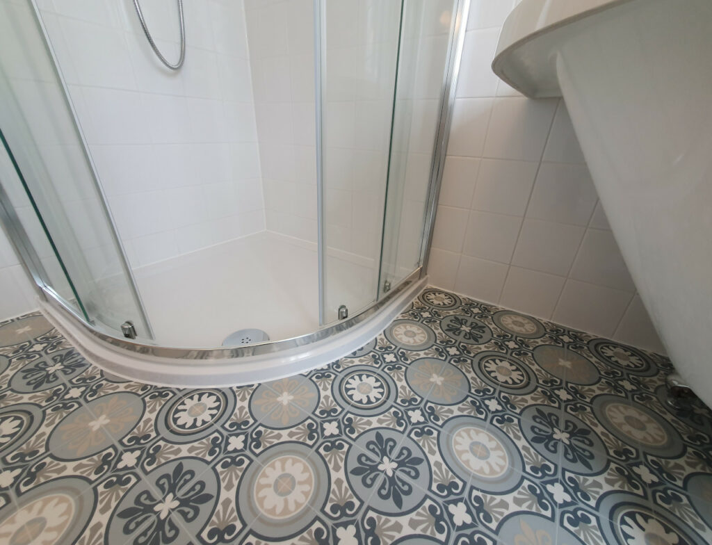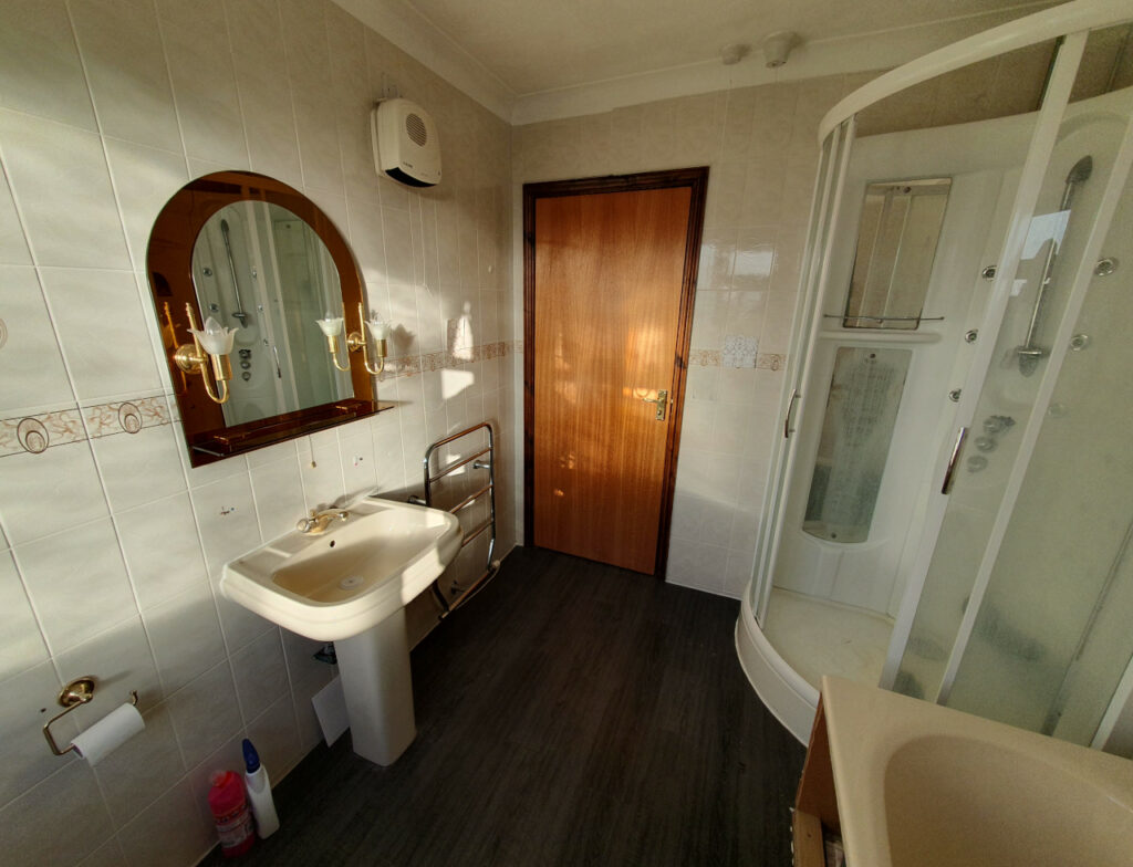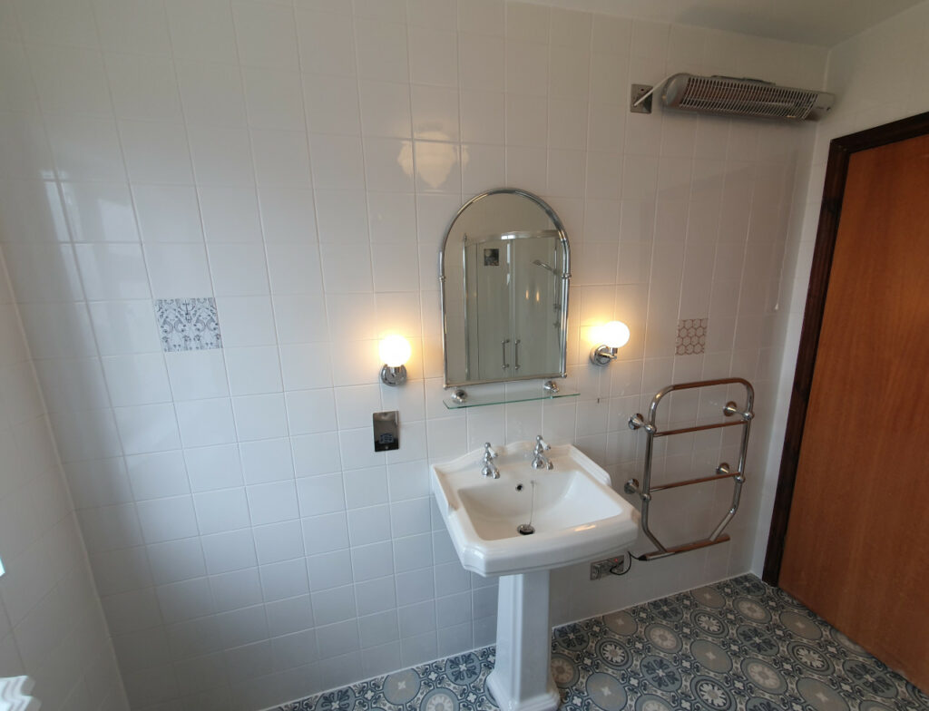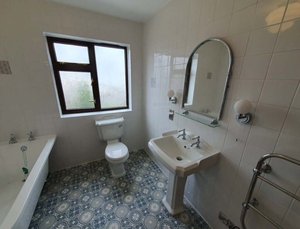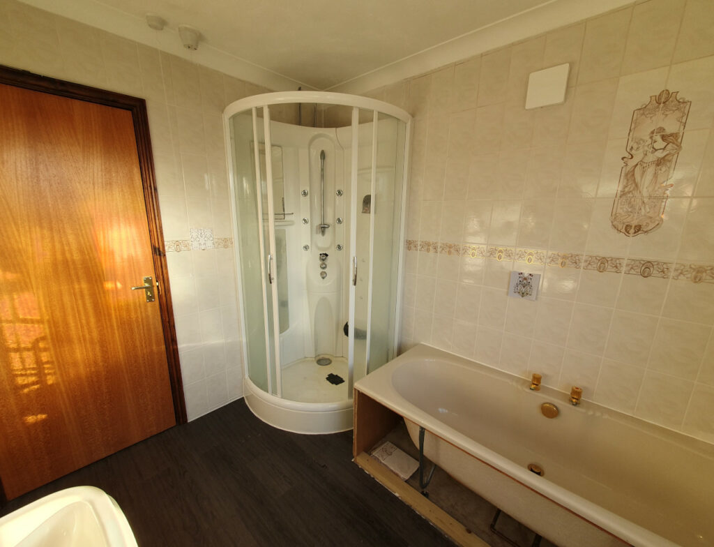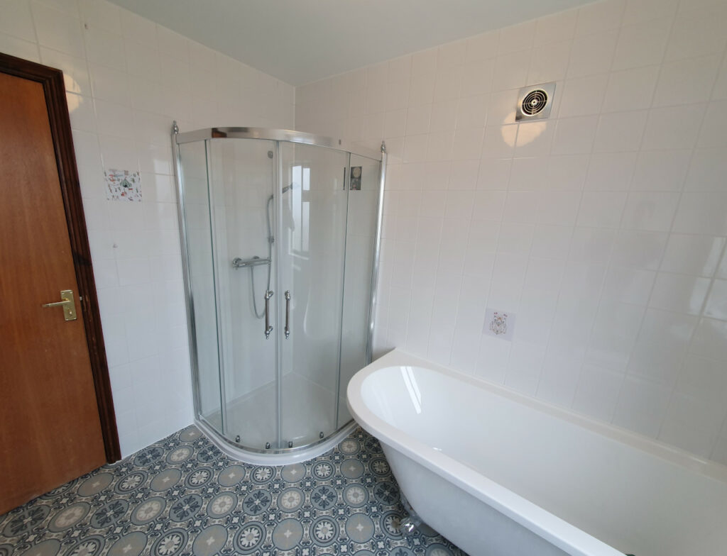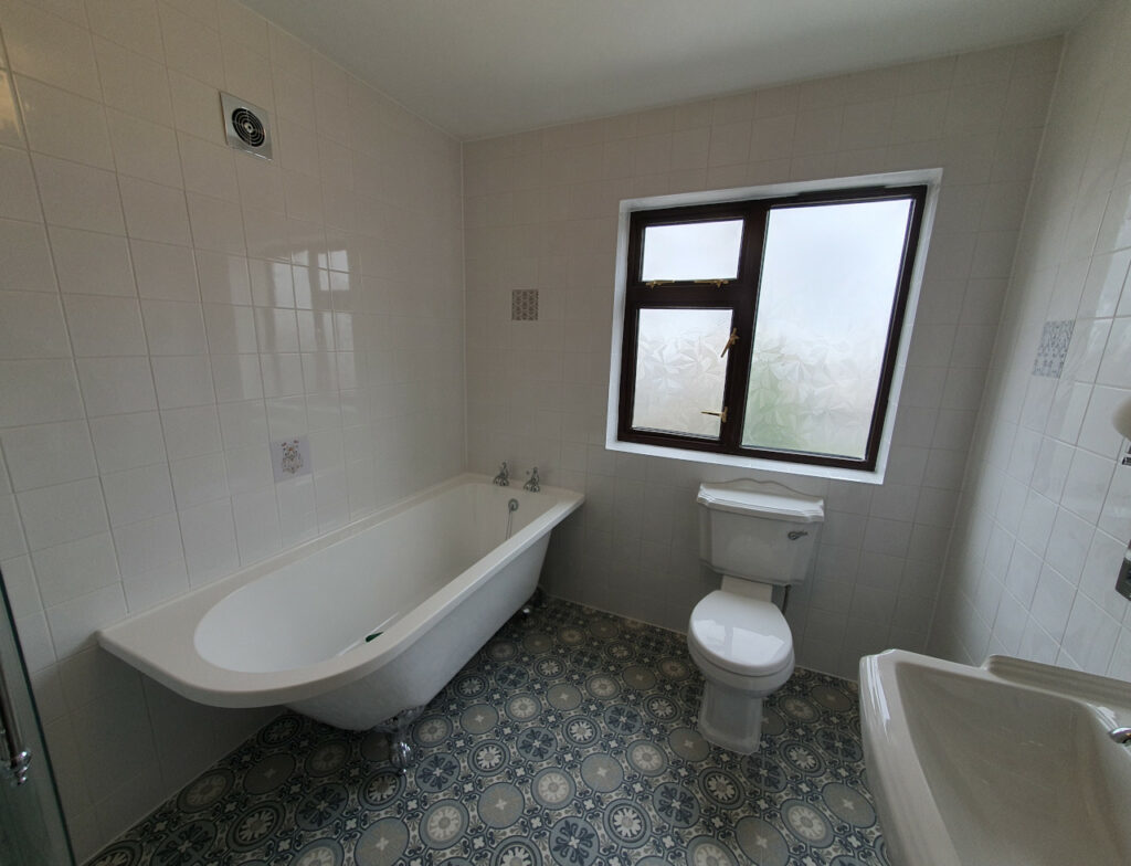 What a wonderful project completed in Parson Drove near Wisbech. Nearly 30 years old bathroom renovated into modern one with style. Work included leveling floor, smoothing ceiling out, replacing soil pipes, tiling and installation. Main feature is beautiful free standing corner bath with chrome legs.