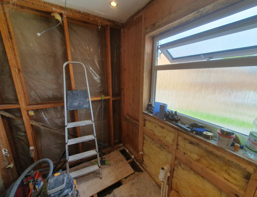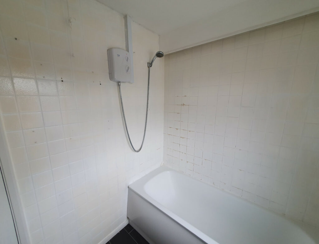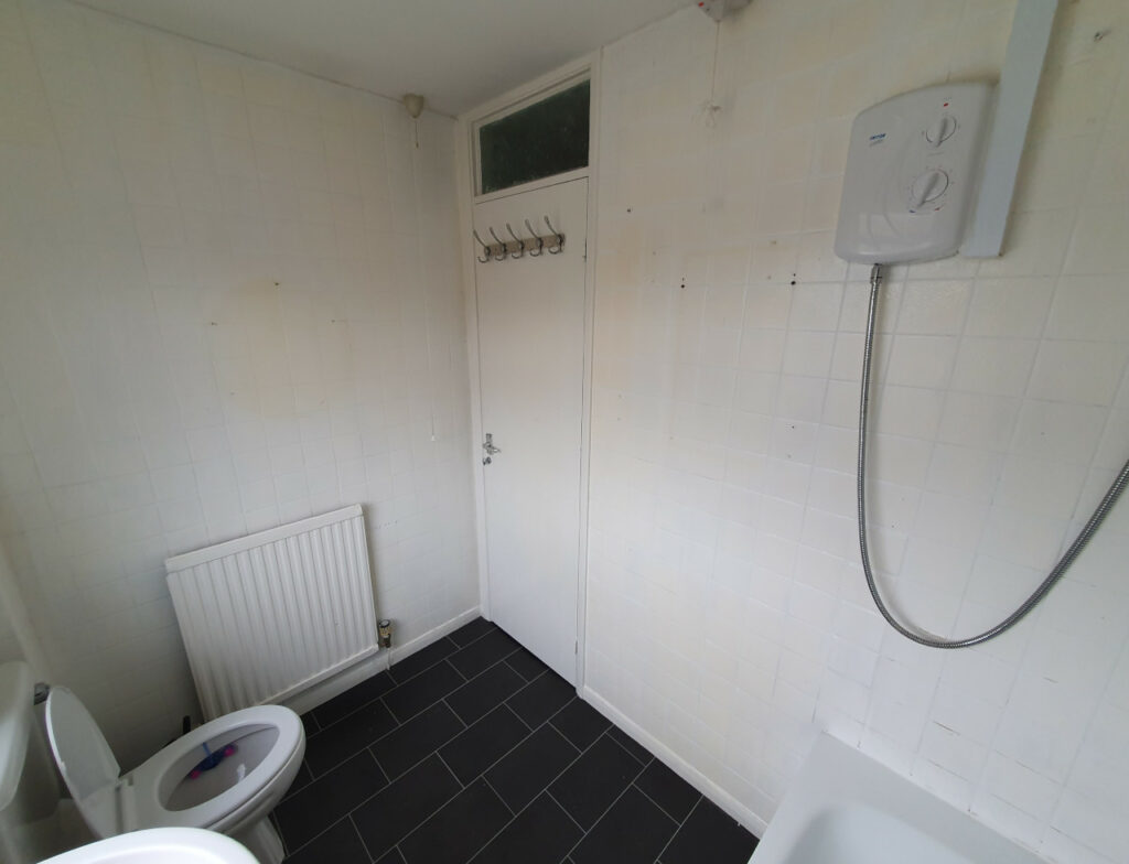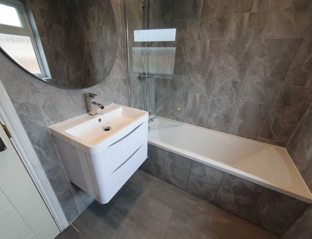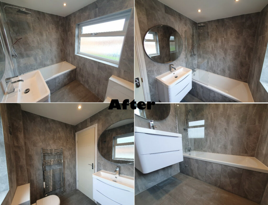 Bathroom completed in Spalding. Work included removing all plasterboard walls, replacing moulded insulation, replacing rooten floor boards, skimming ceiling, installing spotlights, extractor fan, replacing doors and obviously tiling with new sanitary ware.