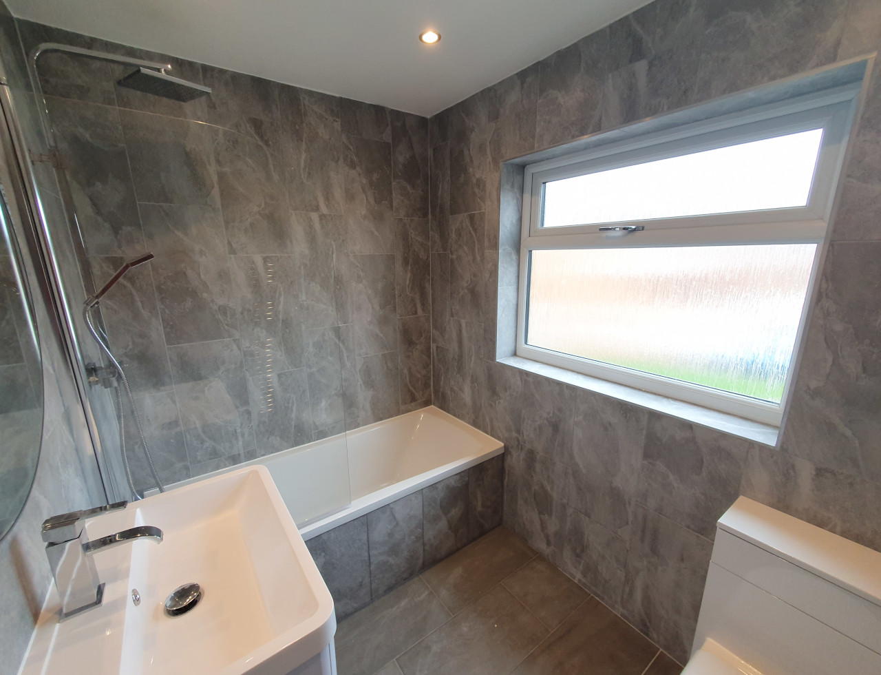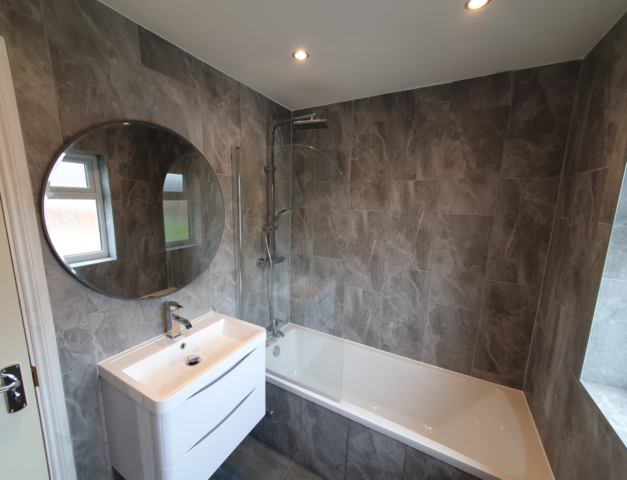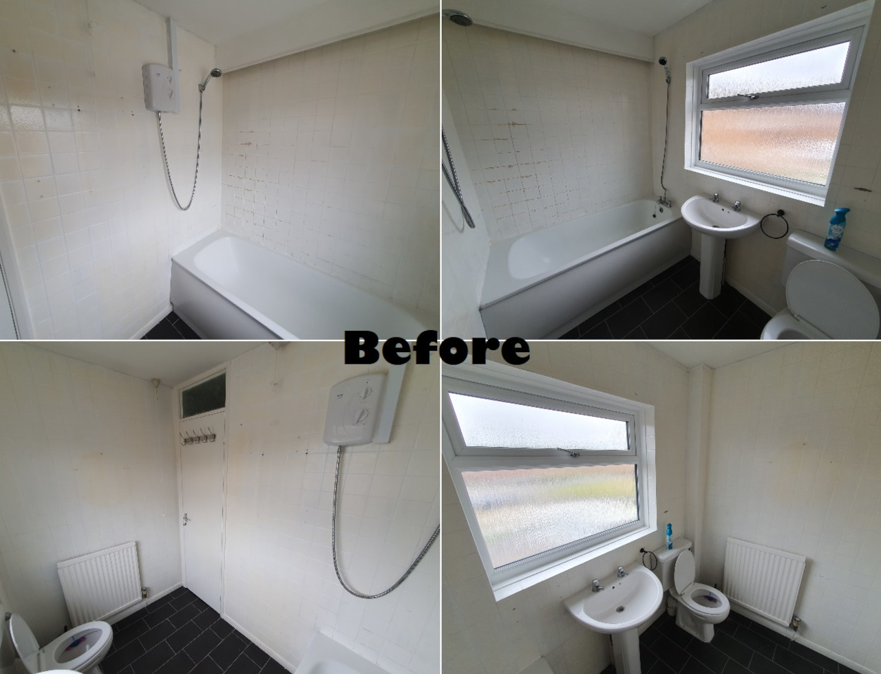 Bathroom completed in Spalding. Work included removing all plasterboard walls, replacing moulded insulation, replacing rooten floor boards, skimming ceiling, installing spotlights, extractor fan, replacing doors and obviously tiling with new sanitary ware.