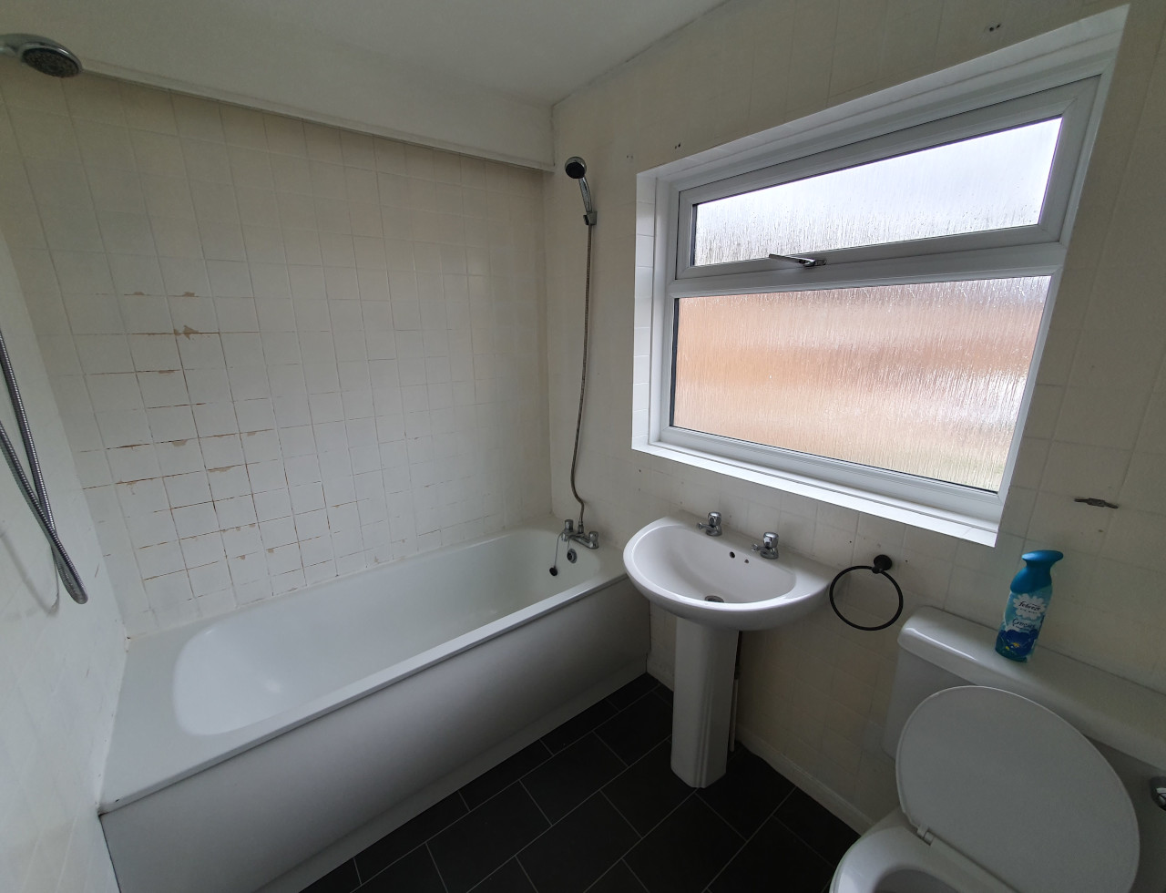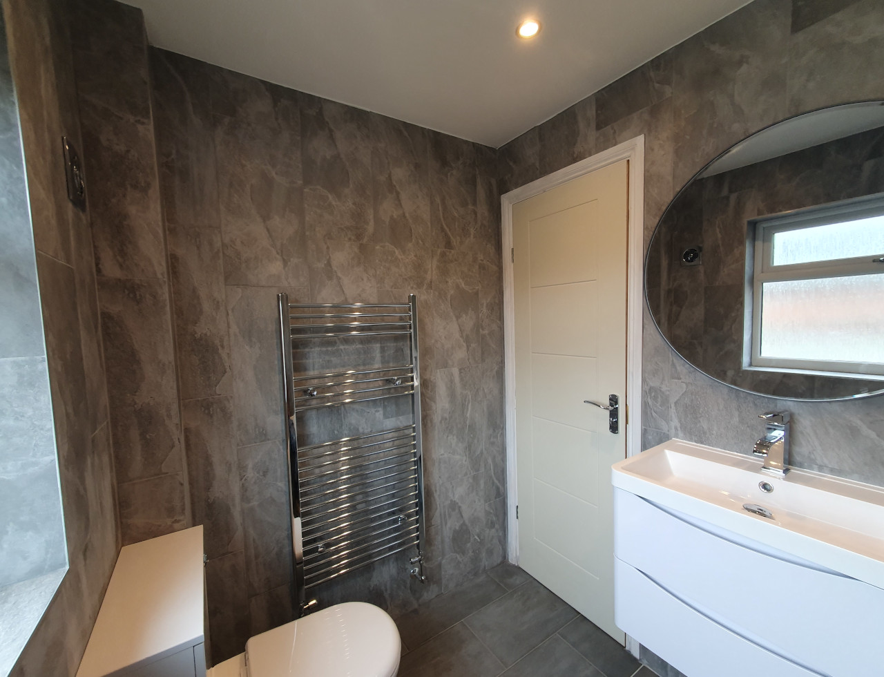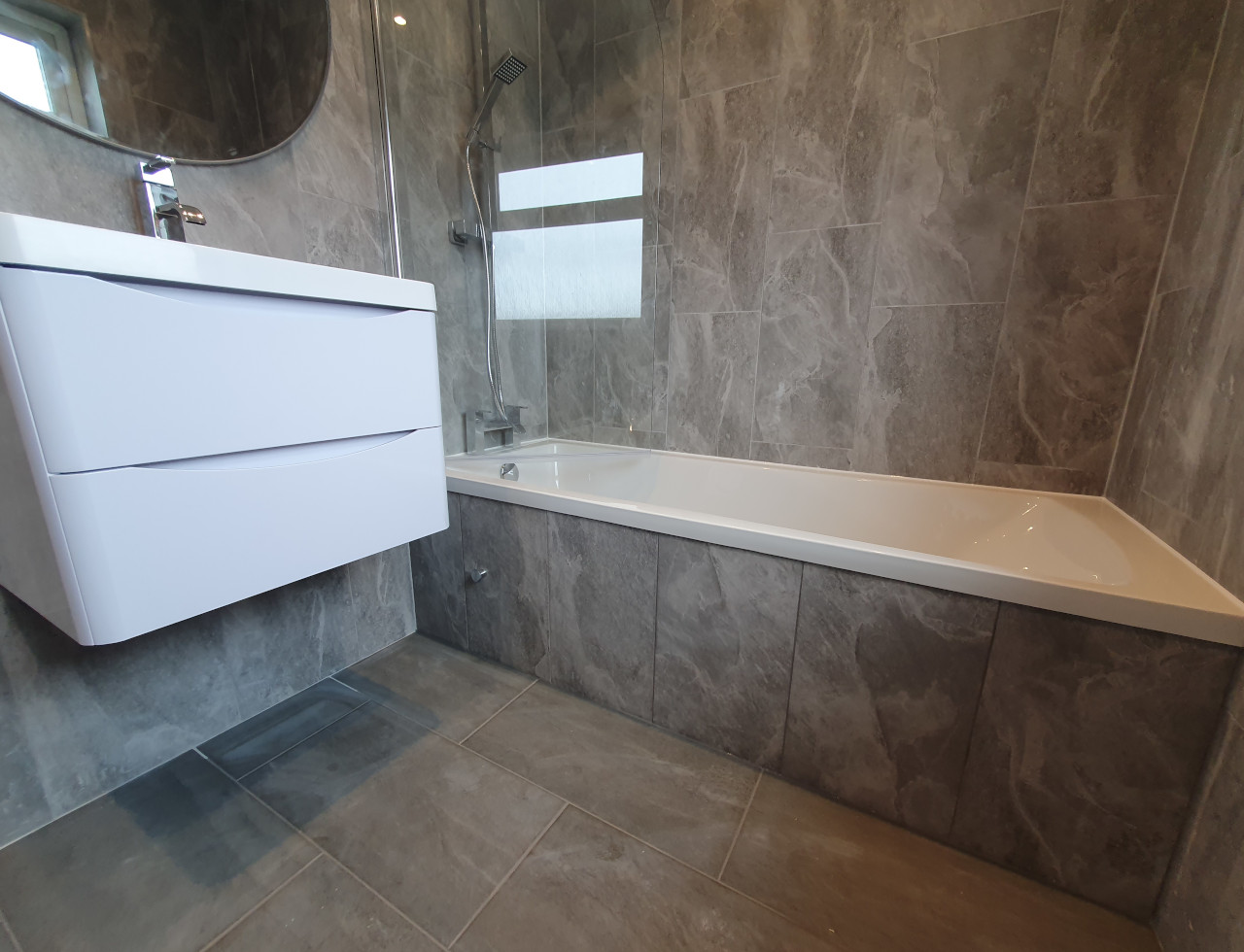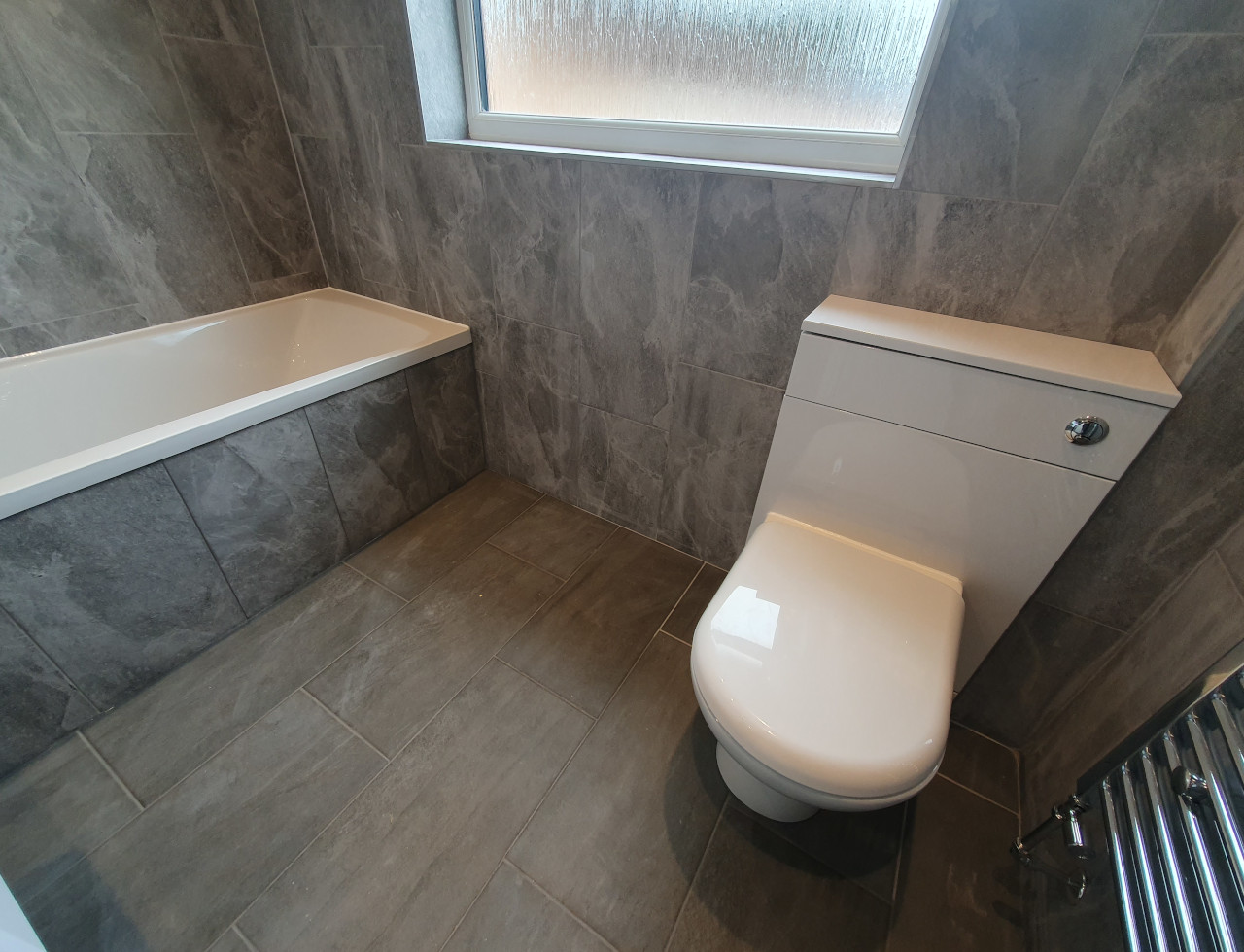Bathroom completed in Spalding. Work included removing all plasterboard walls, replacing moulded insulation, replacing rooten floor boards, skimming ceiling, installing spotlights, extractor fan, replacing doors and obviously tiling with new sanitary ware.