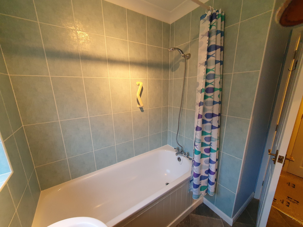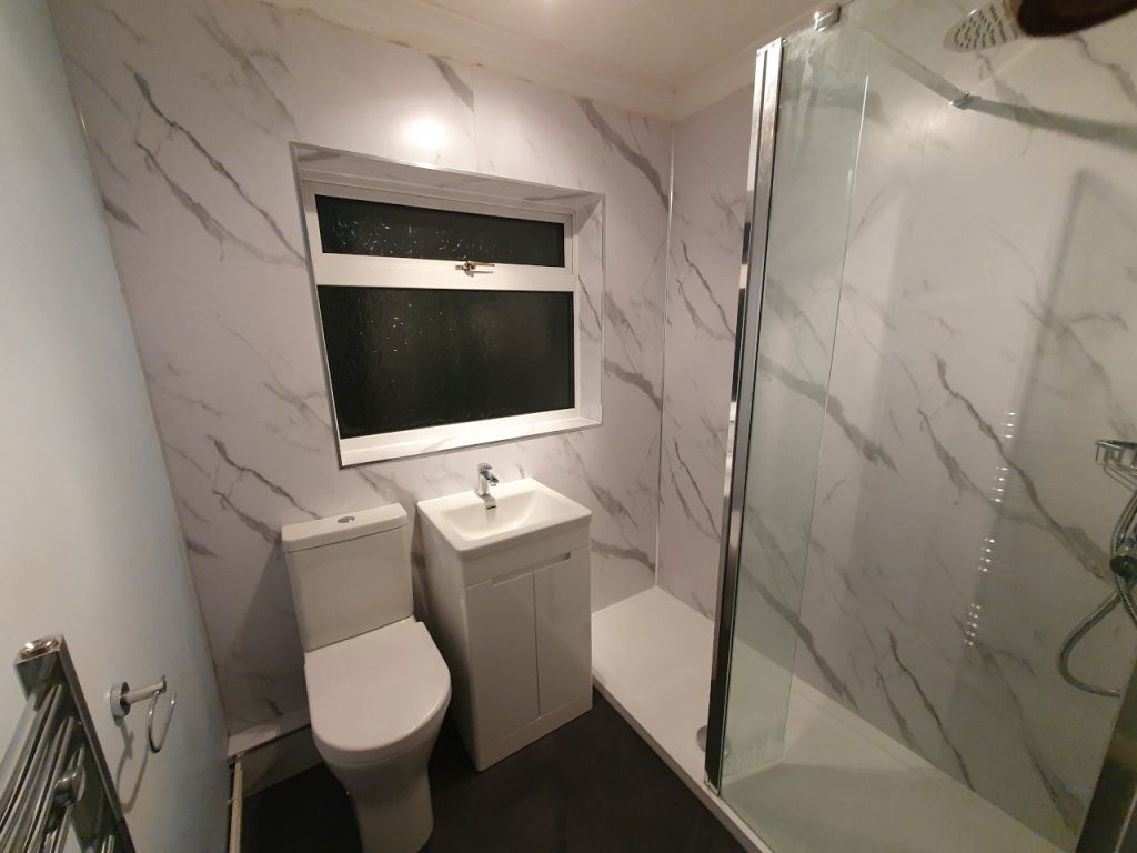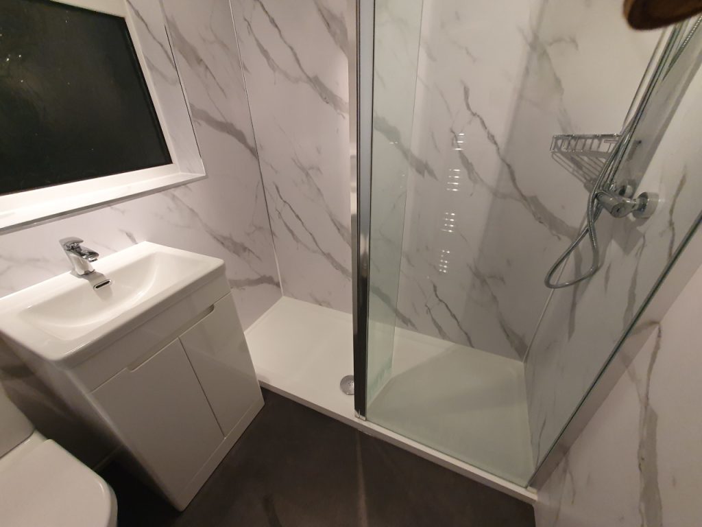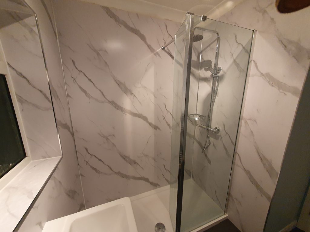 Bath into shower, with shower boards, and new shower pump